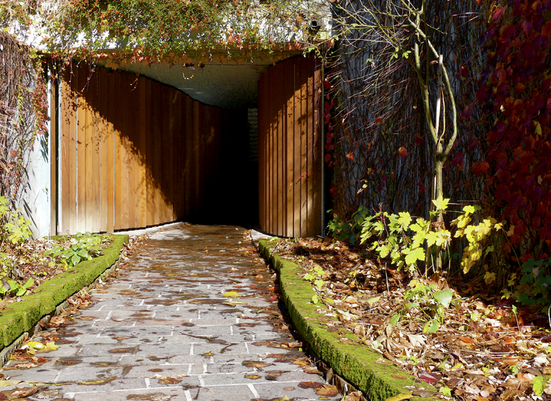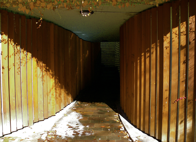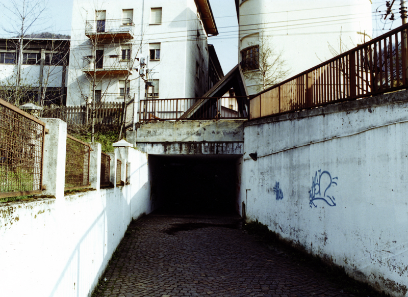La situazione preesistente presentava due muri di contenimento in cemento in stato di parziale degrado e soggetti a periodici atti di vandalismo. Il progetto ha previsto la realizzazione di due aiole con andamento sinuoso a ridosso dei muri all’interno delle quali sono stati piantumati arbusti, piante rampicanti e piante tappezzanti, in modo da formare una cortina di mascheramento delle murature e conferire un aspetto naturale al percorso pedonale. Inotre per rendere più gradevole il tratto più interno del sottopasso è stata prevista la realizzazione di una schermatura con tavole di legno di larice disposte verticalmente. Il percorso è stato ripavimentato con lastre di porfido posato a correre.