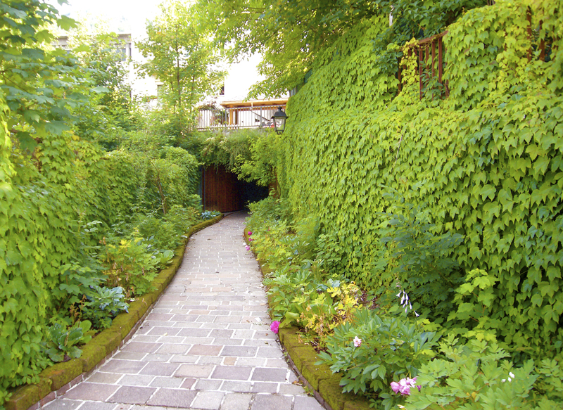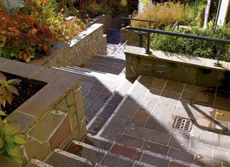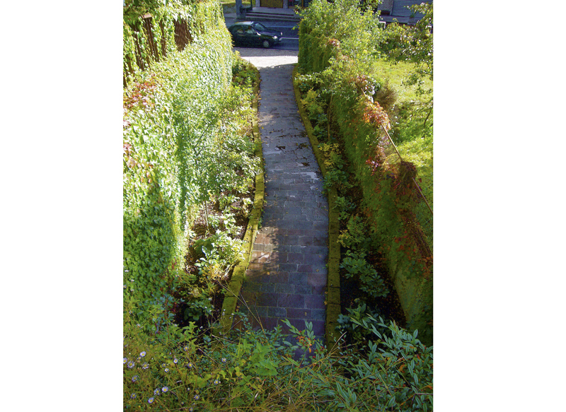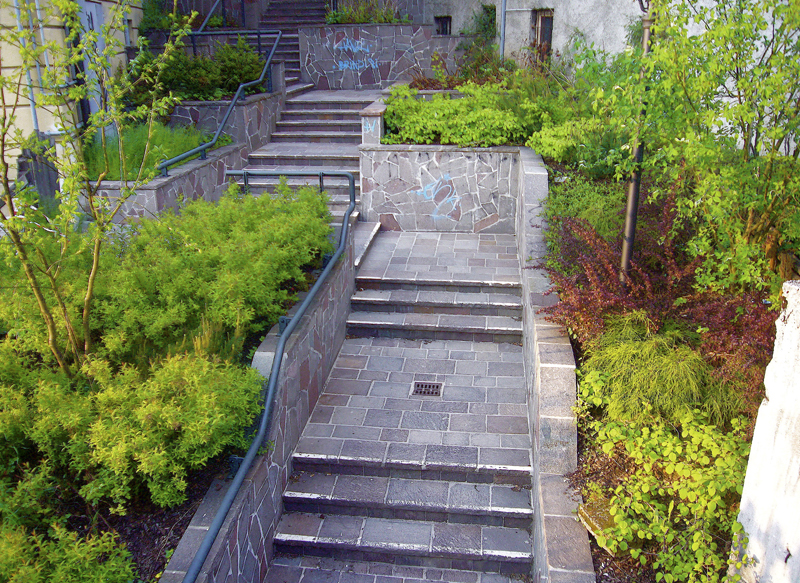 L'area compresa tra gli edifici che fiancheggiano il percorso e le rampe alternate della scalinata è stata terrazzata e sistemata a verde in modo da formare un giardino in pendio.