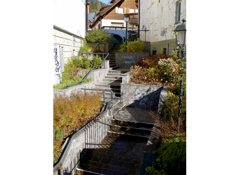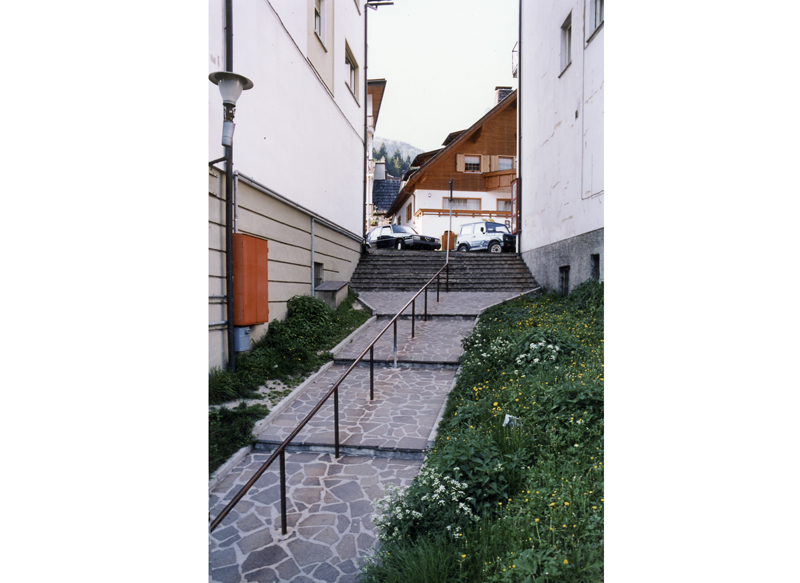 Il progetto ha previsto il rifacimento della preesistente scalinata che presentava gradini in pendenza molto pericolosi nella stagione invernale fiancheggiati da aiole senza nessun ordine formale diventate ricettacolo di immondizie.